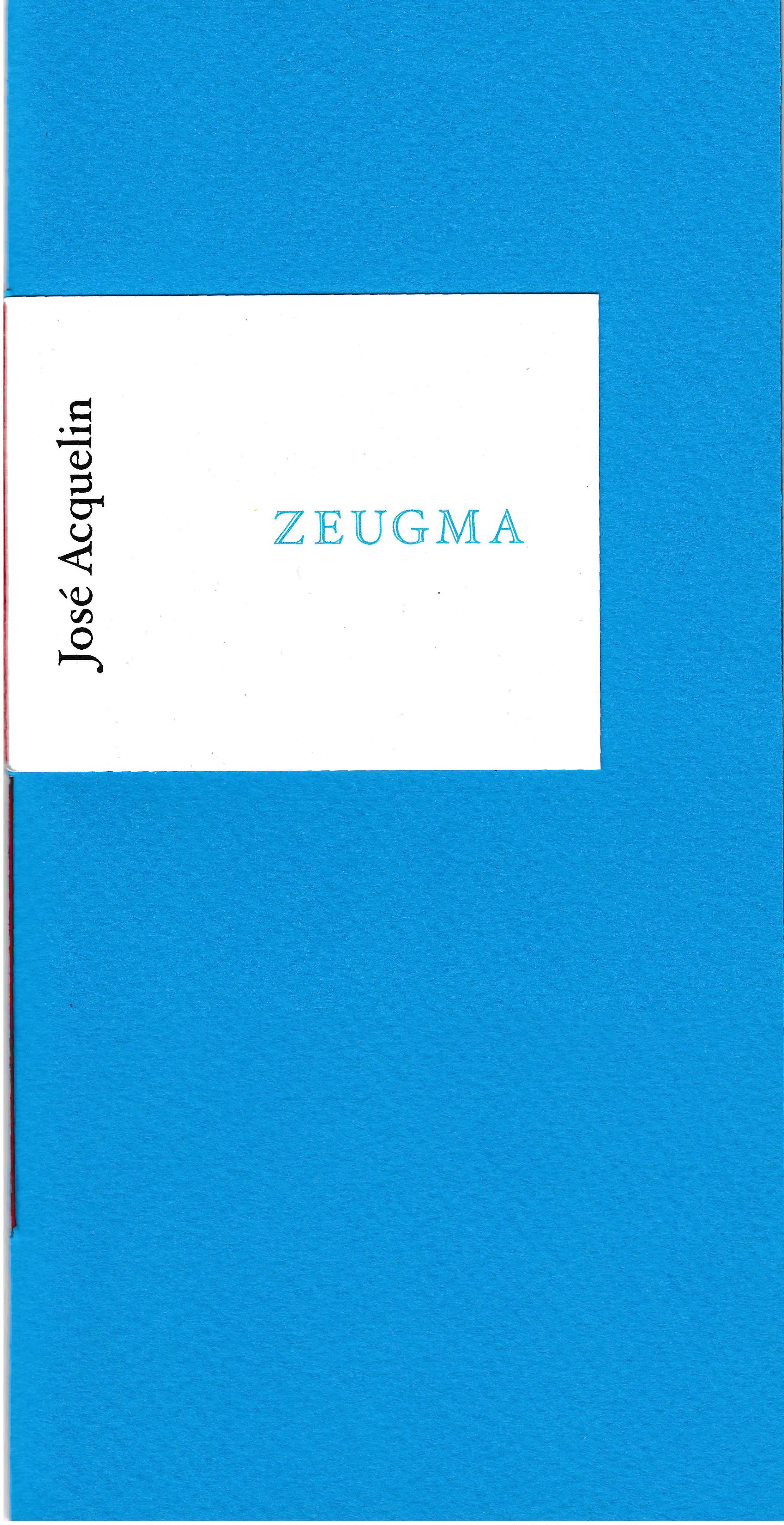 Zeugma de José Acquelin, avec une illustration de Louise Latraverse,  Les loisirs de la poste, numéro un, Montréal, juin 2020, 28p. Tiré à 80 exemplaires.